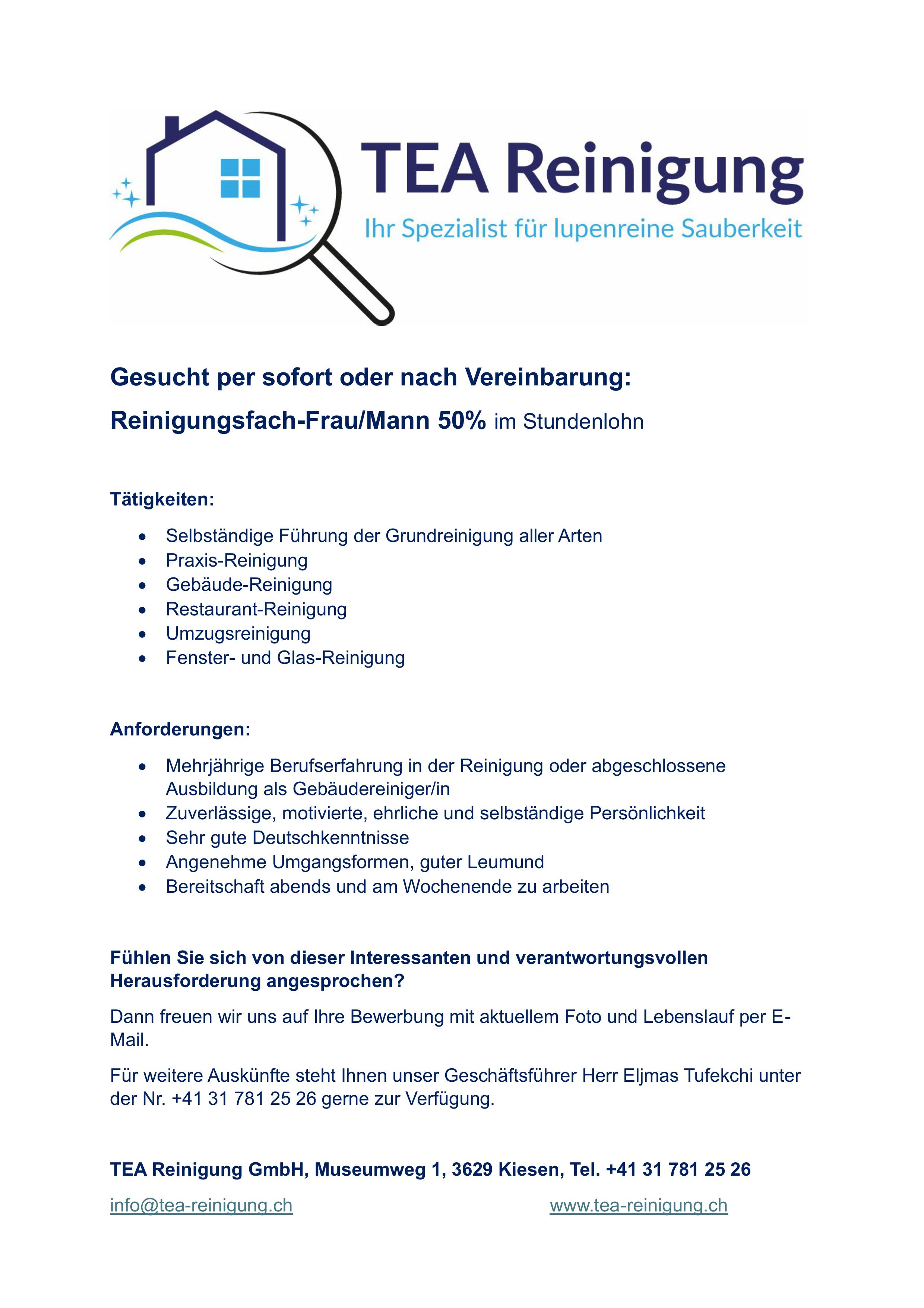 Die TEA Reinigung sucht per sofort oder nach Vereinbarung eine engagierte Reinigungsfachperson (m/w/d) im Stundenlohn (ca. 50 %). Wir betreuen Geschäftskunden, Verwaltungen und Hotels in der Region – professionell, flexibel und persönlich.